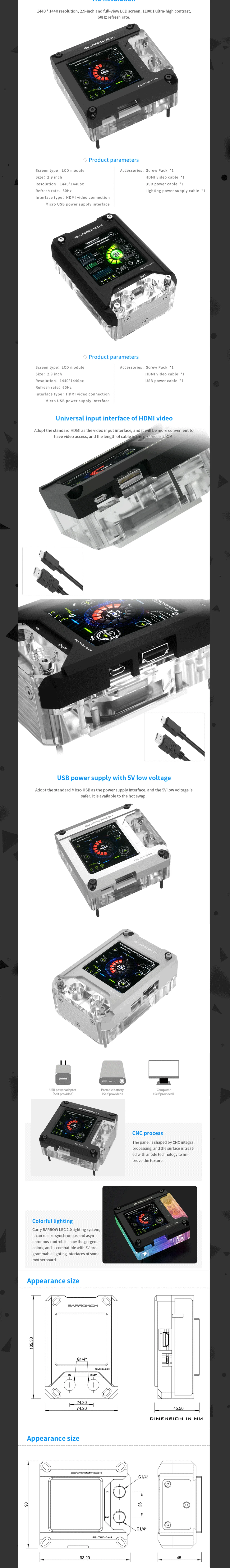 Bloc d'eau CPU multifonction Barrowch avec écran HDMI 1440*1440px 2.9 pouces pour plate-forme Intel/AMD FBLTHD-04N FBLTHDA-04N